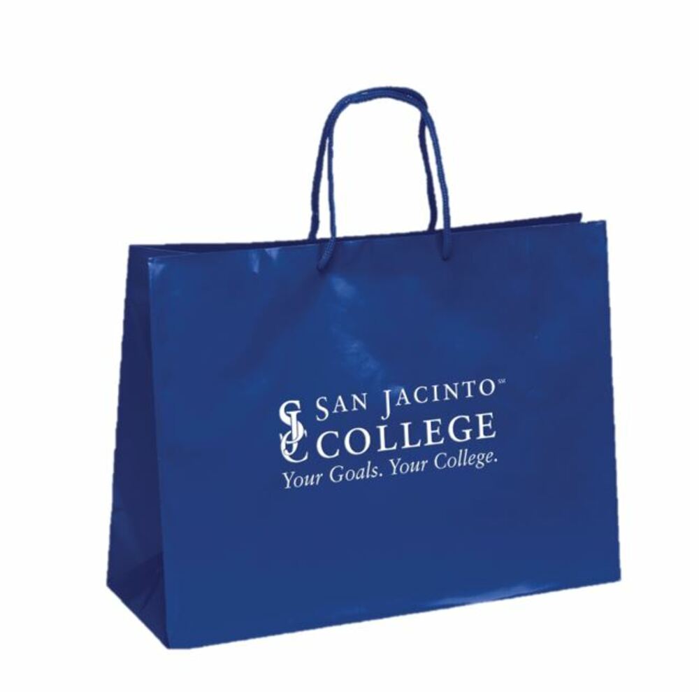 Contact Us128 GSM premium weight gloss laminated eurotote with matching macramé handles, reinforced fold-over top, and cardboard bottom insert.